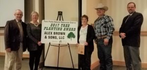 The Twin Platte Natural Resources District is excited to present the 2019 Tree Planting Award to this year’s recipient, John and Shari Jensen. Jensen Ranch has a long history of excellence in conservation, having planted over 2,800 trees in the past 16 years.  The planting of trees as windbreaks in the sandhills serve many purposes and have endless benefits to the land as well as the livestock.  John’s father, Lewis C Jensen, homesteaded the Jensen Ranch in 1913.  In addition to the day to day ranch operation, Lewis hauled freight from the railroad at Lemoyne on the North Platte River, raised hogs, and fed cattle to make ends meet.  In 1926 he married Ruth Hawkins and they made their home on the homestead, and had two children. Lewis continued to make improvements on the ranch as well as adding sections of land as the years went on. In 1943, Lewis passed away as the result of a fatal accident. Ruth took care of the property until 1960, when John graduated from college and was able to return home and manage the ranch.  Through the years there have been additions to the original 640 acres. The ranch operation currently covers 10,360 acres in Arthur and Grant Counties. In 2015, the Jensen Ranch had the honor of receiving the Nebraska Pioneer Farm Award from the Knights of Ak-Sar-Ben Foundation and the Nebraska Farm Bureau. This award is given for agriculture operations which have existed for 100 years.  The first tree planting was done in the 60’s, but came with many complications as there was no weed barrier when the trees were planted.  This site was not accessible to water and seemed to take forever for the trees to grow into a usable protection for the livestock.  The annual replant program finally re-established and is now a very impressive windbreak that works efficiently.  John Jensen served on the board of directors for the TPNRD from 1984 until 1996.  During this time TPNRD began offering weed barrier with all new tree plantings. Since then, the Jensen’s have designed and planted four more plantings with the weed barrier and the success rate has greatly improved.  The protection that these windbreaks provide and the wildlife that inhabits them have made the efforts very much worthwhile.
